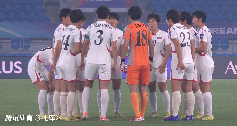 朝鲜女足首发阵容:18-俞鲜金;2-李明金、3-李金香、23-李慧京、14-黄玉咏、10-李鹤、9-金成庆、13-全龙钟、20-蔡恩勇、12-洪成玉、17-金景英