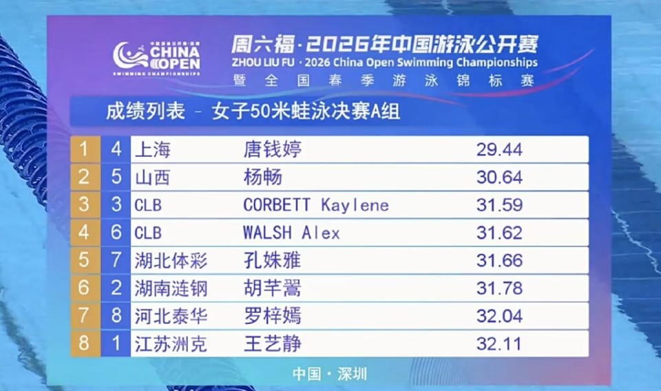 2026-03-19 20:503月19日,2026年中国游泳公开赛迎来首个比赛日。在晚间竞赛单元女子50米蛙泳决赛的比赛当中,唐钱婷以29秒44的成绩夺得金牌,这是她继上午的预赛之后,一天之内第2次打破该项目的亚洲纪录。