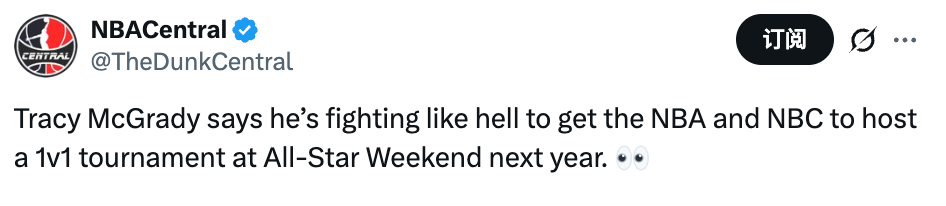 麦迪:正全力推动NBA和NBC合作 希望明年全明星举办单挑锦标赛