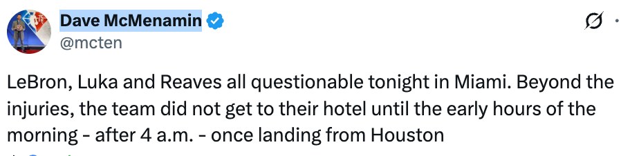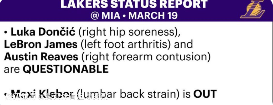 赛前,湖人官方更新了本场比赛的伤病报告,其中詹姆斯、东契奇、里夫斯三位核心的状态均为出战成疑。另外据湖人队记Dave McMenamin报道,除了伤病问题,球队从休斯顿飞抵迈阿密后,当地时间凌晨4点多才抵达酒店。