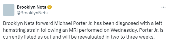 篮网官方:小波特缺阵左腿筋拉伤 两到三周接受复查