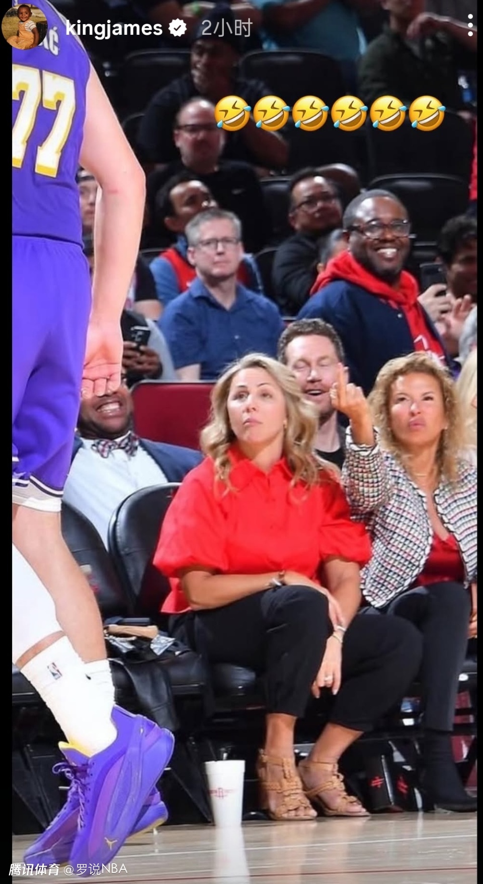 第三个动态很有趣,他在调侃东契奇与球迷的互动。詹姆斯连发6个笑哭表情,晒出场边挑衅球迷对东契奇竖中指的名场面,用幽默方式力挺队友,也暗合了东契奇赛后提到的“被球迷垃圾话点燃斗志”的故事。