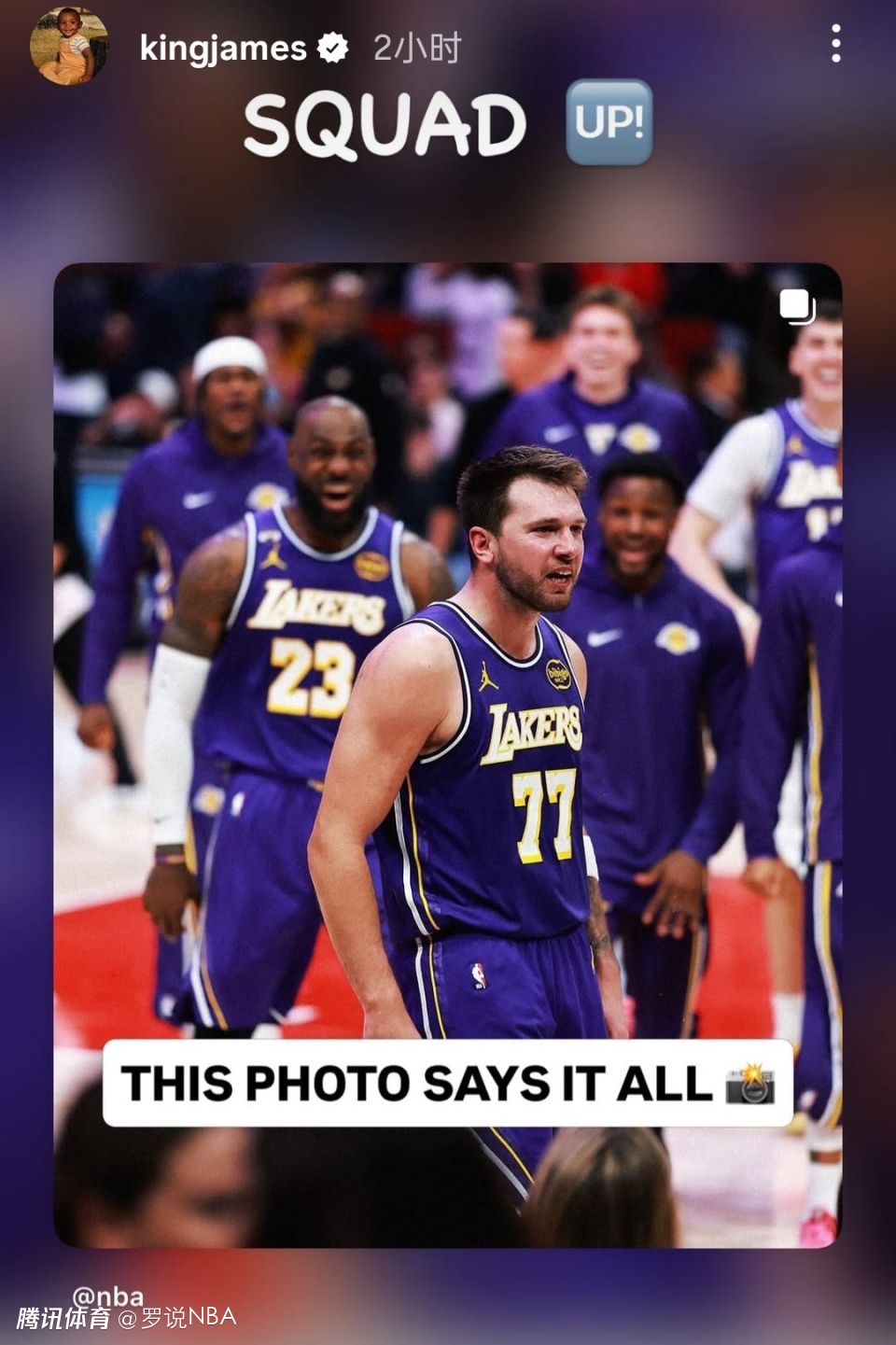 第二个动态是詹姆斯盛赞球队化学反应。转发的是NBA官方社媒的图片,原文“这张图说明了一切”,传递出湖人双核带队、全队士气高涨的信号,也呼应了球队7连胜的火热状态。詹姆斯则加上了自己的备注SQUAD UP(集结)。