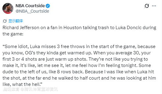 2026-03-20 06:30北京时间3月20日,NBA名宿理查德-杰弗森在播客节目中,谈到此前比赛中,休斯顿一位球迷对东契奇说垃圾话一事。