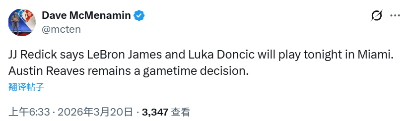 2026-03-20 06:50北京时间3月20日,湖人官方宣布,詹姆斯(左脚关节炎)、东契奇(右髋酸痛)都已经升级为可以出战,将出战今日对热火的背靠背比赛。此前他俩和里夫斯都被列为出战成疑的状态,里夫斯(右臂挫伤)能否出战将在赛前决定。