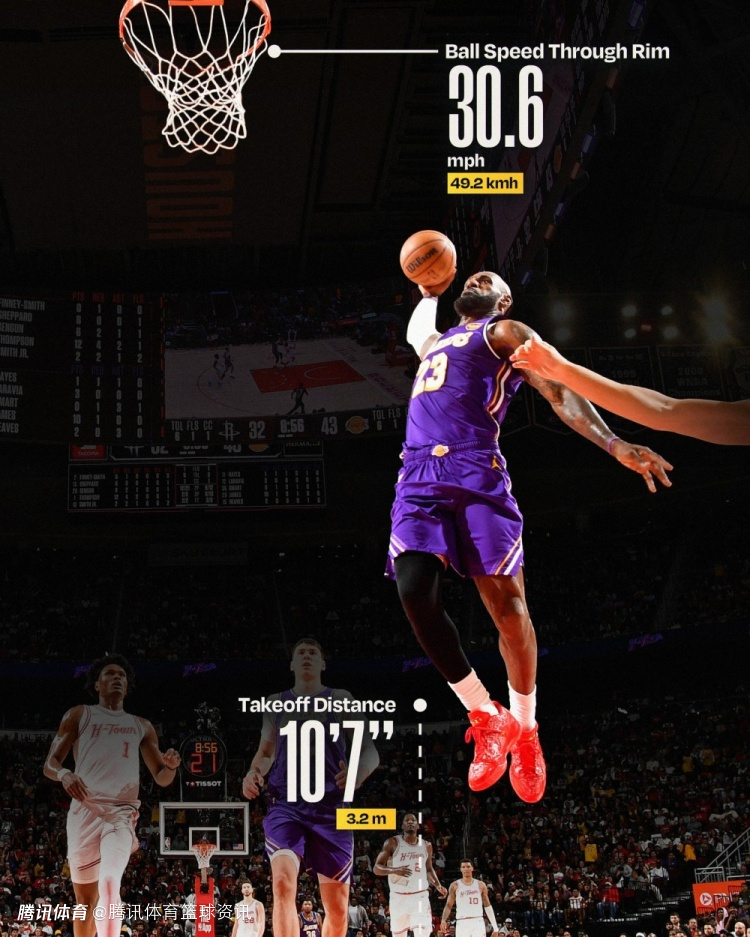 詹姆斯昨日劈扣排本赛季起跳距离第三:距篮筐3.2米+入网时速49.2公里