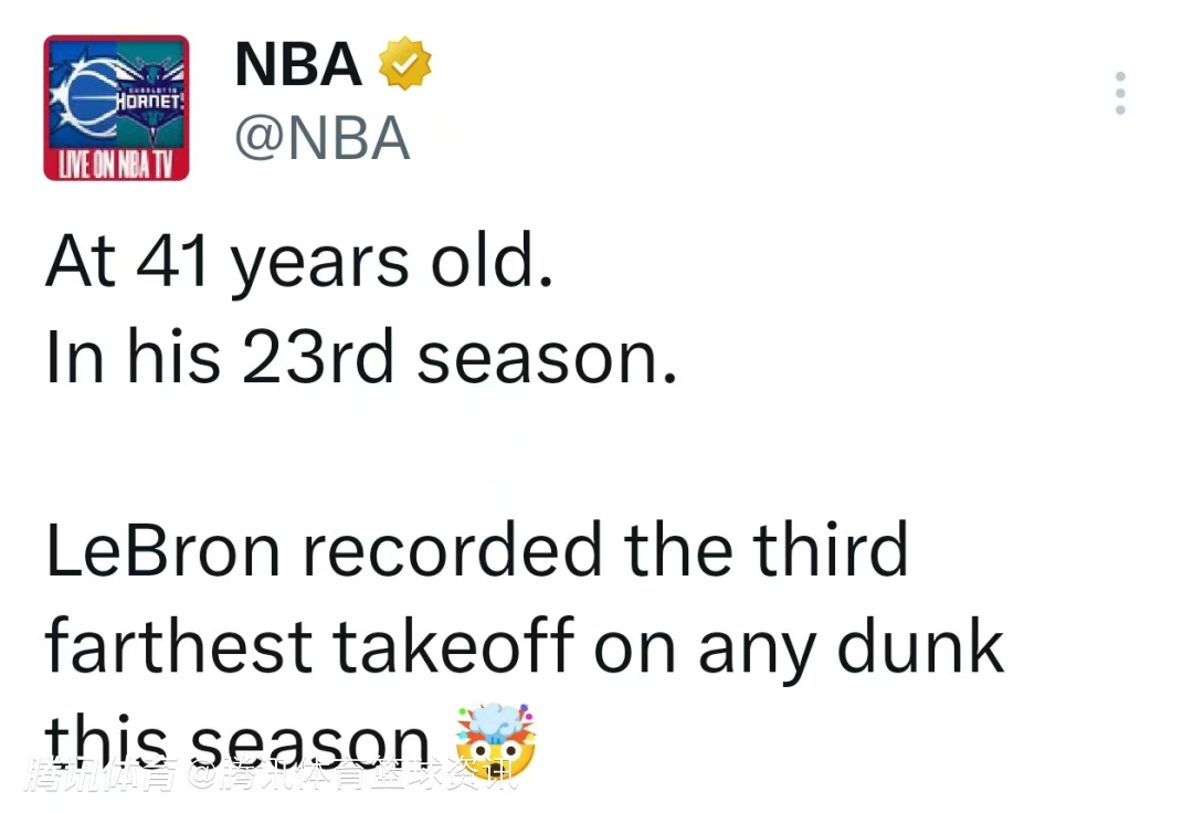 NBA官方配文写道:“41岁,生涯第23个赛季,詹姆斯依旧状态不减。这记扣篮位列本赛季扣篮起跳距离第三,令人震撼。”