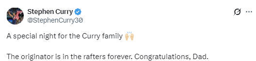 斯蒂芬-库里还发文写道:“这是属于库里家族的特别夜晚,开创者的球衣将永远高悬球馆穹顶。恭喜你,爸爸。”