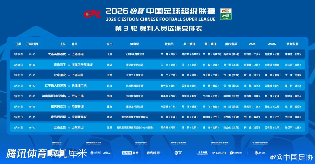 2026-03-20 10:10北京时间3月20日,中超第3轮比赛即将打响。赛前,中国足协官方公布了本轮的执法裁判名单,其中北京国安和上海申花的京沪大战,由马宁主哨,包括王竞、王迪、戴弋戈、穆禹辰、李海新、张雷和单丹奥将在本轮作为主裁参与执法,其中李海新执法重庆铜梁龙和成都蓉城的川渝德比。