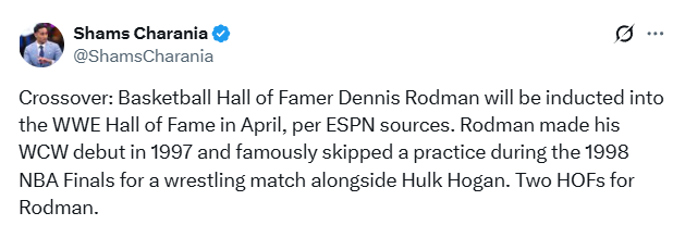 历史唯一!Shams:罗德曼4月入选WWE名人堂 11年曾入选篮球名人堂