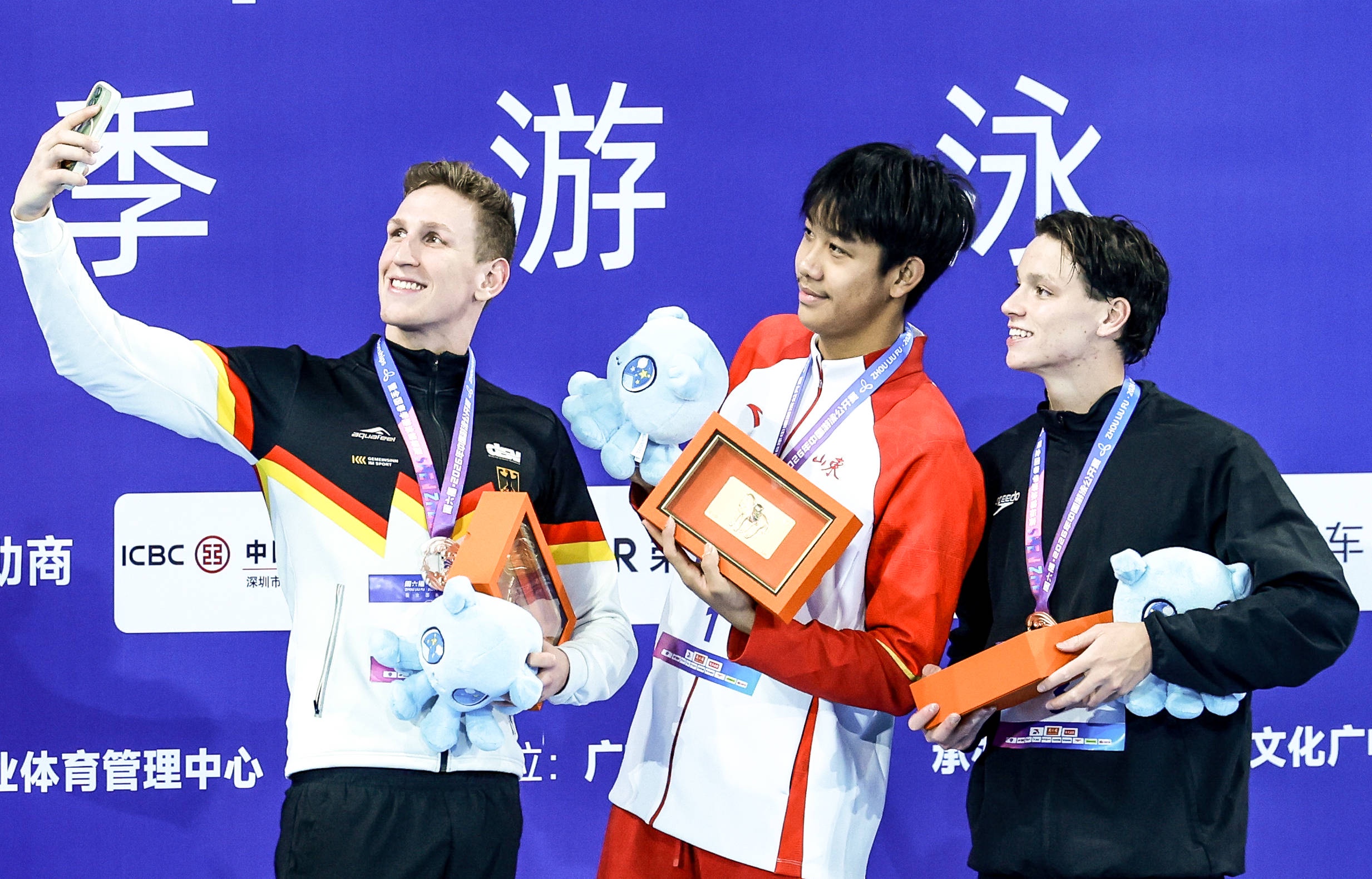 张展硕(中)与亚军梅尔滕斯(左)、季军彼得里奇在200米自由泳颁奖仪式上。 图/新华社 彭志刚
