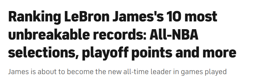这或许是詹姆斯最知名、最具标志性的纪录,地位堪比MLB的本垒打纪录。“谁得分最多”是评判球员伟大最直观、最简单的标准,只是未必最精准。