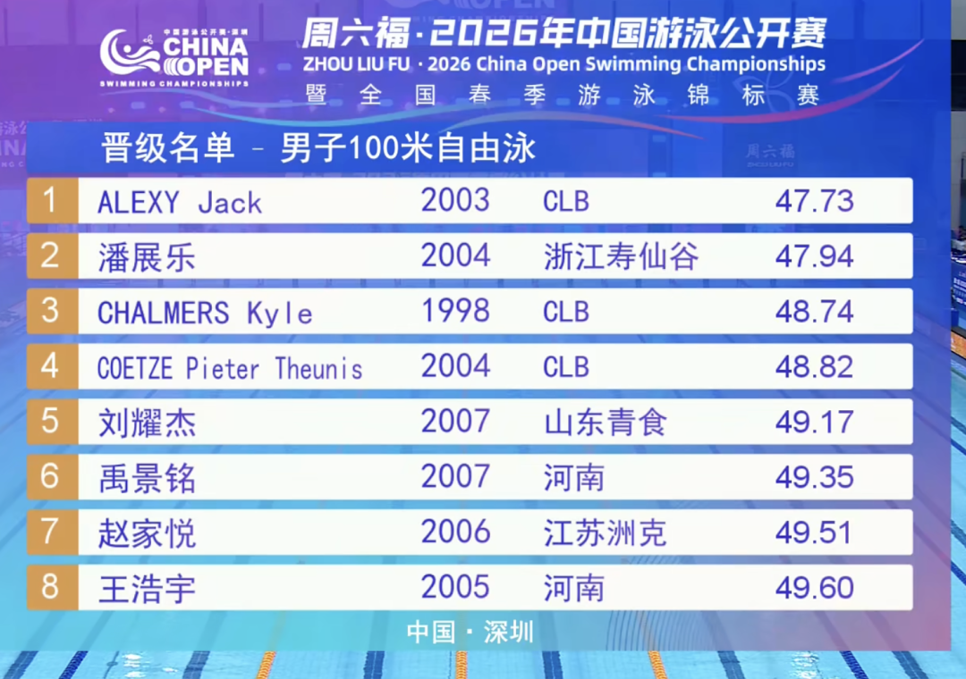 晋级决赛的总排名中,潘展乐第二,阿莱克西47秒73排名第一,查尔默斯48秒74排名第三。