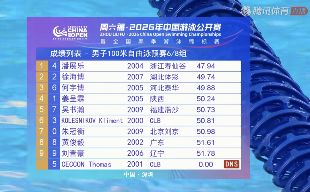 2026-03-21 10:203月21日上午,2026年中国游泳公开赛暨全国春季游泳锦标赛在深圳大运中心游泳馆进行第三比赛日预赛。万众期待的男子100米自由泳正式打响,巴黎奥运会冠军、世界纪录保持者潘展乐在第六组出战,以47秒94的成绩拿下小组第一,顺利晋级今晚A组决赛,切孔弃权。