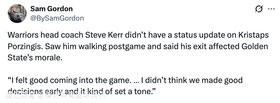 谈及本场比赛伤退的波神,科尔表示:“他说背部一开始就有点发紧,然后在那次球被拨出去的回合里,后背被顶了一下,导致伤势加重了一点。除此之外我就不清楚了。我还没跟队里的医疗人员聊过。”