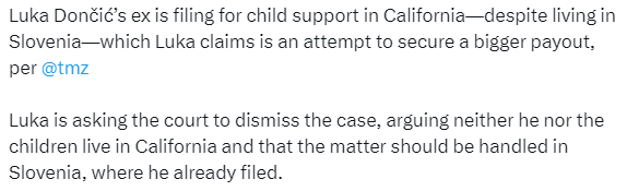 TMZ获悉,东契奇已经向法院申请驳回他的前未婚妻的子女抚养费和律师费的诉求,理由是安娜玛利亚在加州提起诉讼,而她明知孩子们都生活在斯洛文尼亚。
