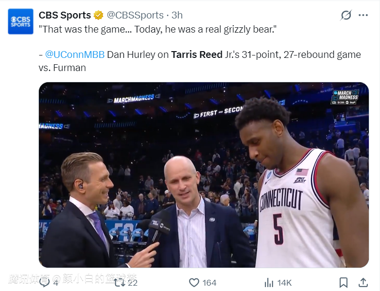 此役身高2.11米的小塔里斯-里德,34分钟,15中12,罚球9中7,拿到31分27篮板3助攻,命中率80%,这场比赛打出了NCAA生涯最高的一场比赛。