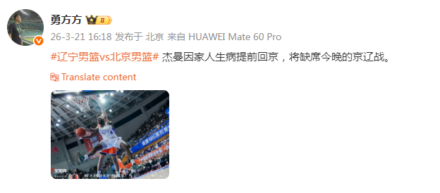 2026-03-21 20:10北京媒体人勇方方透露,北京男篮外援杰曼因家人生病提前回京,将无法出战今晚和辽宁队的比赛。