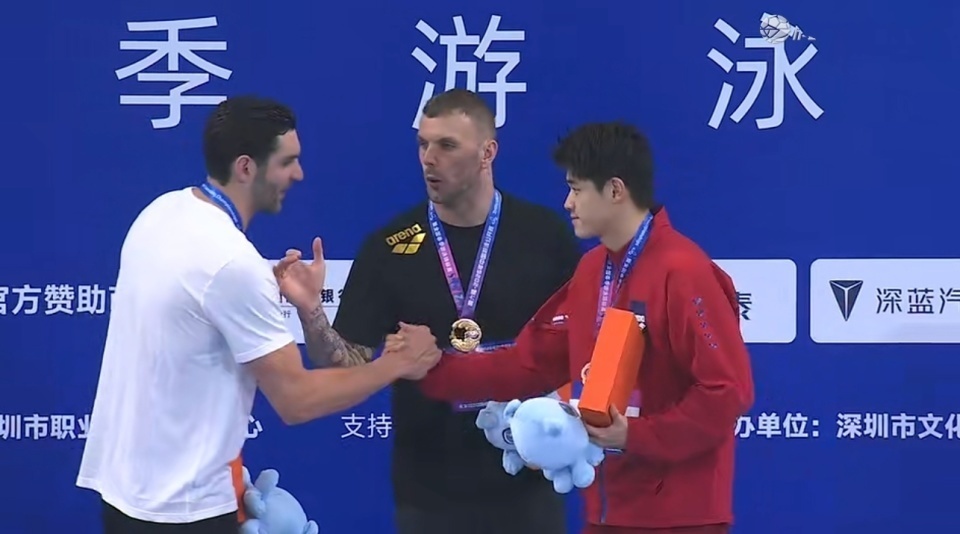 最后的冲刺里,董志豪在加频率,但卡明加顶住了,第一个触壁;两位中国选手也超过佩特里克,顺利站上领奖台。