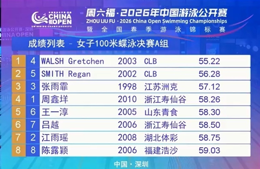 预赛里,格雷琴.沃尔什第一,史密斯第二,张雨霏排在第三。