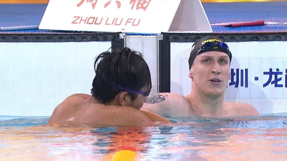 前半程不相伯仲,转身时阿莱克西22秒60排第一,赵家悦0.18秒之差第二紧随其后,查尔莫斯22秒94排在第三,潘展乐和科策未能进入前三。