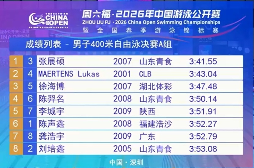 游泳公开赛第三日:张展硕400自破青年纪录,摘第三冠!外协揽5金