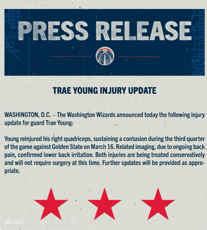 在3月17日对阵勇士队的比赛,特雷-杨的右股四头肌再次受伤。同时,因持续背痛进行的相关影像学检查,确认其存在下背部刺激反应。两处伤情目前均采取保守治疗,暂无需手术。后续将视情况发布进一步更新。