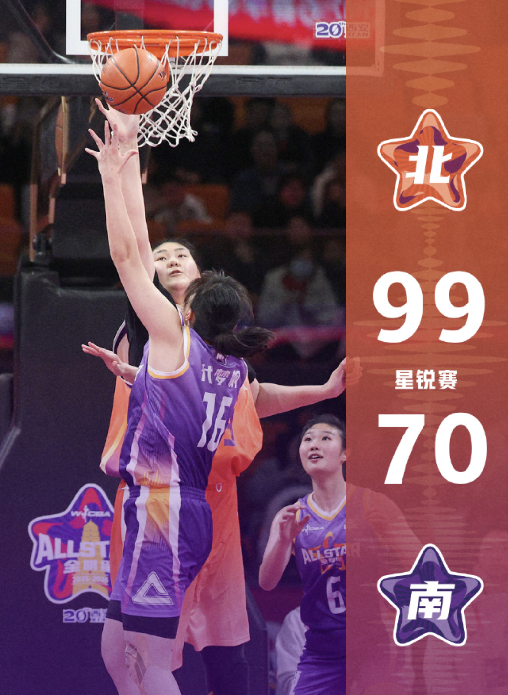 终场哨响,北区星锐队99:70战胜南区星锐队。