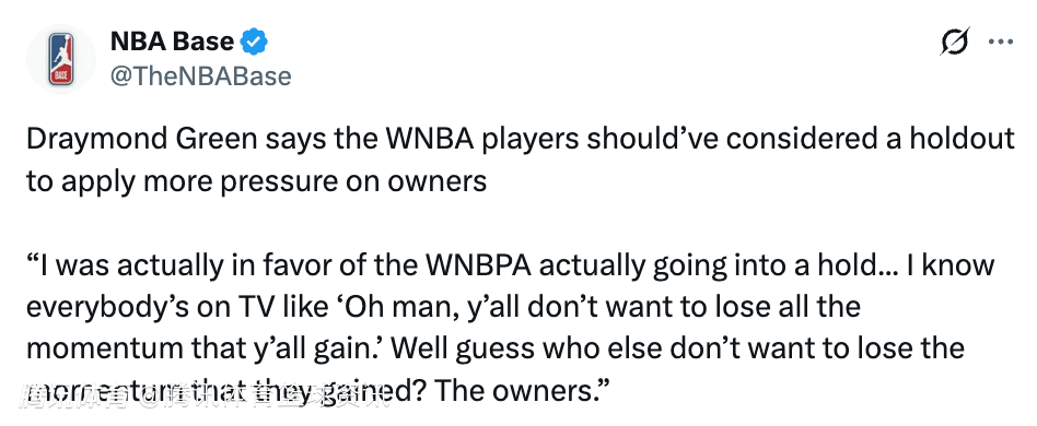 追梦表示,WNBA 球员本应考虑罢赛,以此向联盟老板们施加更大压力:“我其实是支持 WNBA球员工会(WNBPA)采取罢赛行动的,我知道所有人都在电视上说‘天啊,你们可不想丢掉好不容易攒下的热度吧’。那你猜猜看,还有谁也不想失去这股热度?是那些老板们。”