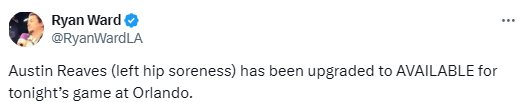 剑指9连胜!湖人更新伤情:里夫斯升级为可以出战 克勒贝尔无缘战魔术