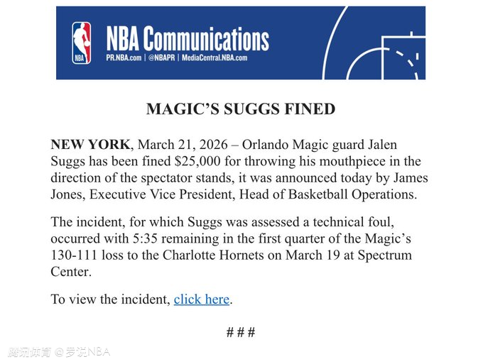 2026-03-22 05:20北京时间3月22日,NBA官方发布公告,连开两张罚单。76人中锋在球场上做出射击的庆祝动作,被罚款25000美元,而魔术后卫萨格斯因朝着观众席扔牙套,也被罚25000美元。