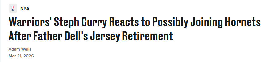 2026-03-22 06:00北京时间3月22日,斯蒂芬-库里目前并不打算离开金州勇士,但在父亲戴尔-库里的球衣被黄蜂队退役之后,他至少调侃了自己未来有可能加盟夏洛特黄蜂。