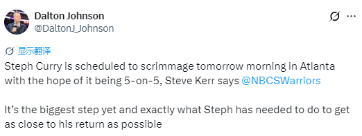 科尔表示,库里计划明天上午参加对抗训练,希望能进行5对5全场合练。“这是目前为止最重要的一步,也是库里为尽快复出所需要完成的关键环节。”