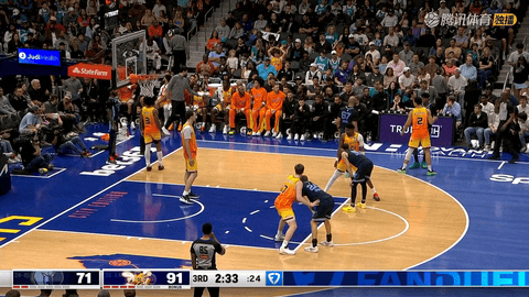 截至第四节还剩7分39秒时,黄蜂全队已经命中18记三分球,其中鲍尔投中7记、米勒和西恩-詹姆斯各有3记,依靠外线火力从开局平分打出最多领先25分的巨大优势。