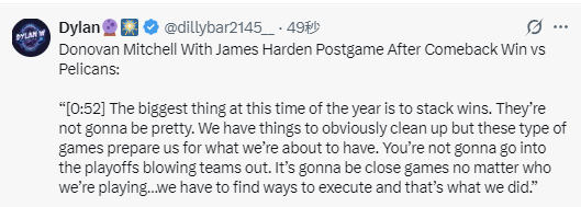 2026-03-22 10:30北京时间3月22日,NBA常规赛继续进行,骑士队111-106击败鹈鹕队。米切尔此役23投9中得到27分7篮板3助攻1抢断,赛后他接受媒体采访。