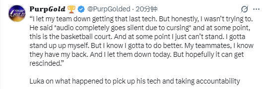 在谈到自己吃到技术犯规时,东契奇表示:“最后那次吃到技犯,是我拖累了球队。说实话,我并不是故意的,比塔泽用塞尔维亚语辱骂了自己的母亲。这里明明是篮球场,有些话我实在忍不了,我必须为自己挺身而出。不过我知道我需要做得更好。队友们一直都挺我,今天我却辜负了他们。希望这次技术犯规能够被撤销。”