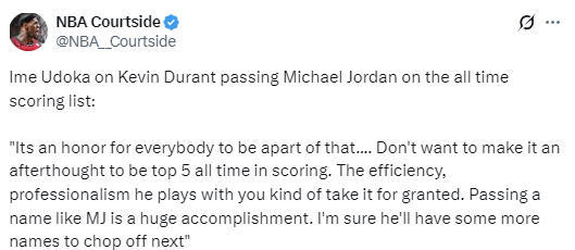 本场比赛,杜兰特生涯总得分超越乔丹,升至NBA历史第5位。乌度卡在谈到此事时表示:“能见证这一刻,对所有人来说都是一种荣幸,历史得分榜前五,绝不是一件理所当然的小事。他打球的效率、职业态度,大家有时习以为常。超越乔丹这样的传奇,是一项巨大成就。我相信接下来,他还会继续超越更多传奇名宿。”
