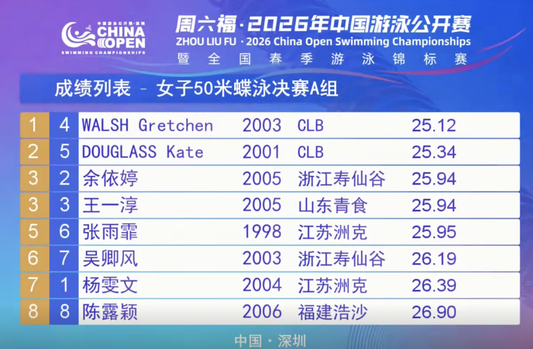 2026-03-22 20:00北京时间3月22日晚,2026年中国游泳公开赛暨全国春季游泳锦标赛在深圳大运中心继续进行。女子50米蝶泳决赛,美国名将格雷琴·沃尔什以25秒12强势夺冠,队友凯特·道格拉斯25秒34摘银,中国选手余依婷和王一淳同以25秒94并列获得季军,张雨霏以25秒95位列第五。