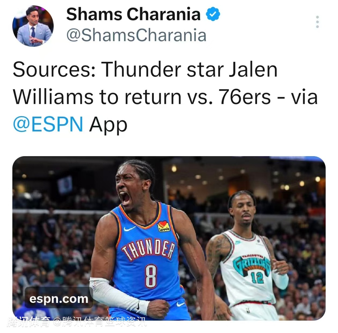 2026-03-23 05:20北京时间3月23日,据名记Shams报道,雷霆队明星前锋杰伦-威廉姆斯已从伤病名单中移除,将在周二客场对阵76人的比赛中复出。他因右腿筋拉伤,已缺阵超过五周。