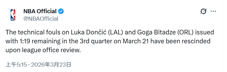 2026-03-23 05:30北京时间3月23日,NBA官方宣布,经过复核,3月22日第三节剩余1分19秒时,判给湖人的东契奇与魔术的比塔泽的技术犯规已正式撤销。这也意味着东契奇的第16次技犯已经撤销,他将不会在周二对阵活塞的比赛中被禁赛。