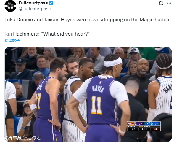 昨天湖人在客场105-104绝杀魔术,肯纳德0.6秒三分绝杀救主,此役东契奇出战38分钟,30投12中、三分13中3拿到33分5篮板8助攻4抢断1盖帽;期间魔术布置战术,东契奇围过来偷听战术,海斯也加入进来,杰特-霍华德制止东契奇,卢卡回复:这又不是暂停。