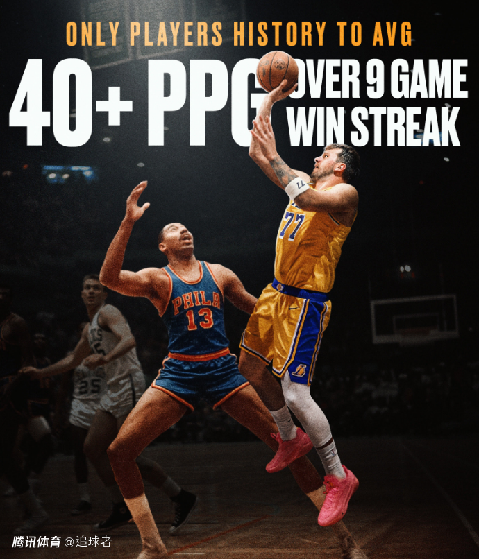 湖人豪取9连胜,期间东契奇打出逆天表现,场均可以狂砍40.9分8.9篮板7.4助攻和2.4抢断,投篮命中率高达50.2%;东契奇比肩张伯伦,成为历史上仅有的两位在9连胜期间场均至少轰下40分的球员。