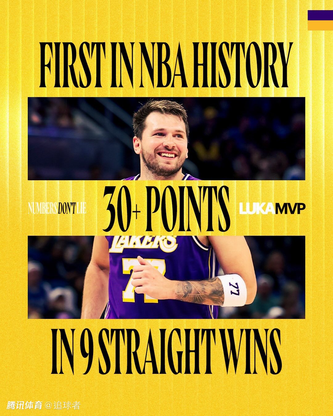 东契奇成为史上第一位连续9场30+且9场全胜的球员,今日湖人官方晒海报祝贺卢卡,每张海报上都配着LUKAMVP,还配文写道:东契奇在球队9连胜期间全部砍下30+,NBA历史首人!