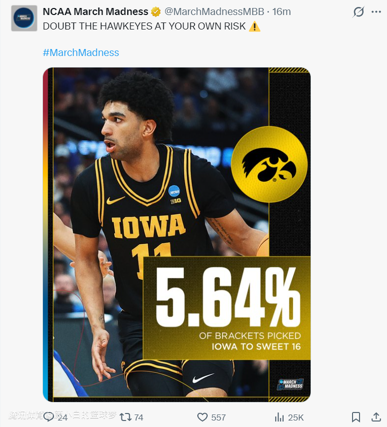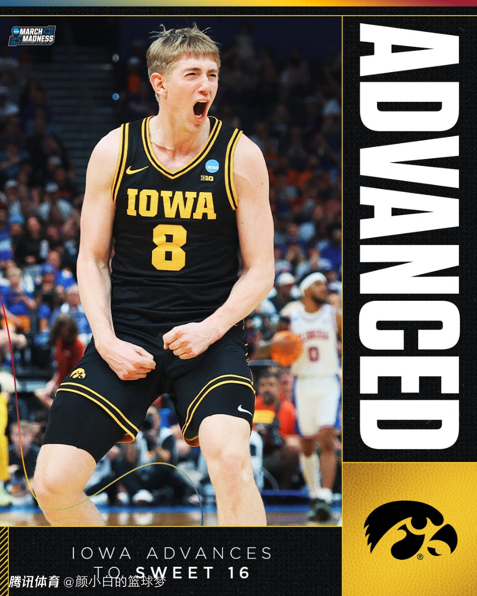 爱荷华大学也是自1999年来首次进入NCAA甜蜜16强,他们创造了队史27年的纪录,而且他们是在仅有5.64%赢球概率的背景下爆冷卫冕冠军。