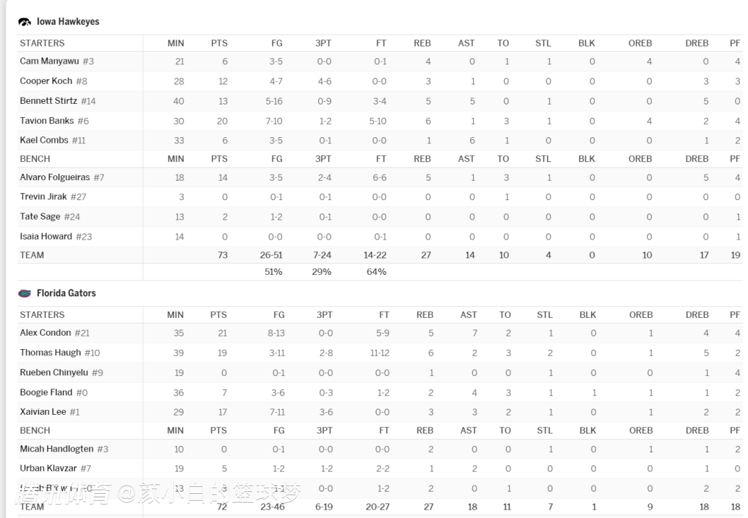 爱荷华大学的班克斯30分钟,10中7,三分2中1,拿到20分6篮板1助攻1抢断,命中率70%;全队有4人上双,爱荷华大学打得更团队一些。