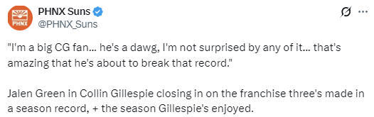 在谈到吉莱斯皮的表现时,格林说道:“我超喜欢吉莱斯皮,他球风强硬、斗志拉满,他打成这样我一点都不意外。他马上就要打破队史单赛季三分纪录了,真的太厉害了。”