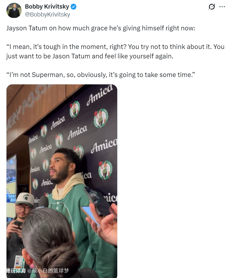 塔图姆还说道:我从那些经历过跟腱断裂的球员、我的家人、医护人员中获得了一些慰藉,毕竟大伤后心理上的创伤跟身体一样难以愈合。
