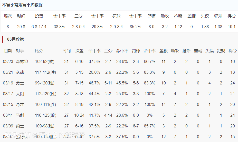 塔图姆复出的8场比赛,场均29.8分钟,拿到19.1分8.9篮板3.2助攻1.12抢断,命中率38.8%,三分命中率29.3%,一场比赛塔图姆要打10.4次铁,场均三分打铁6.6次,这个表现实在是令人无奈。
