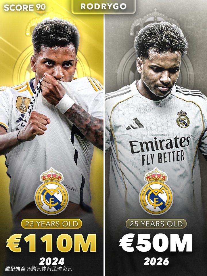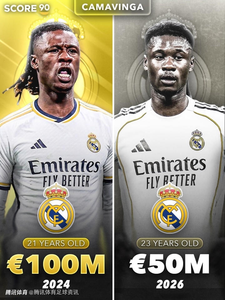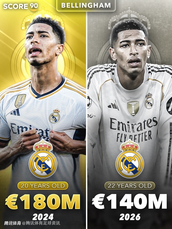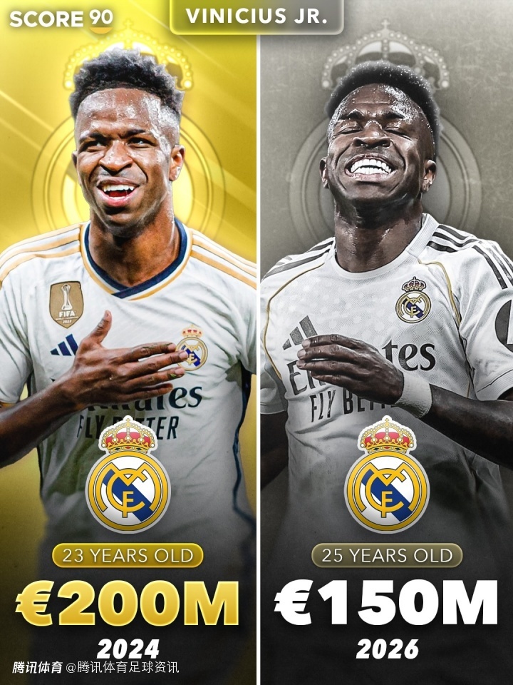 皇马近2年身价大缩水!维尼修斯跌5000万 贝林厄姆跌4000万