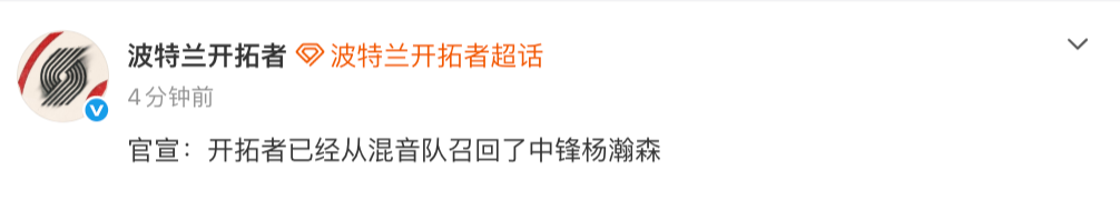 2026-03-24 00:00北京时间3月23日,开拓者官方宣布,球队已经从混音队召回了杨瀚森。明日上午10点,开拓者将在主场对阵篮网。